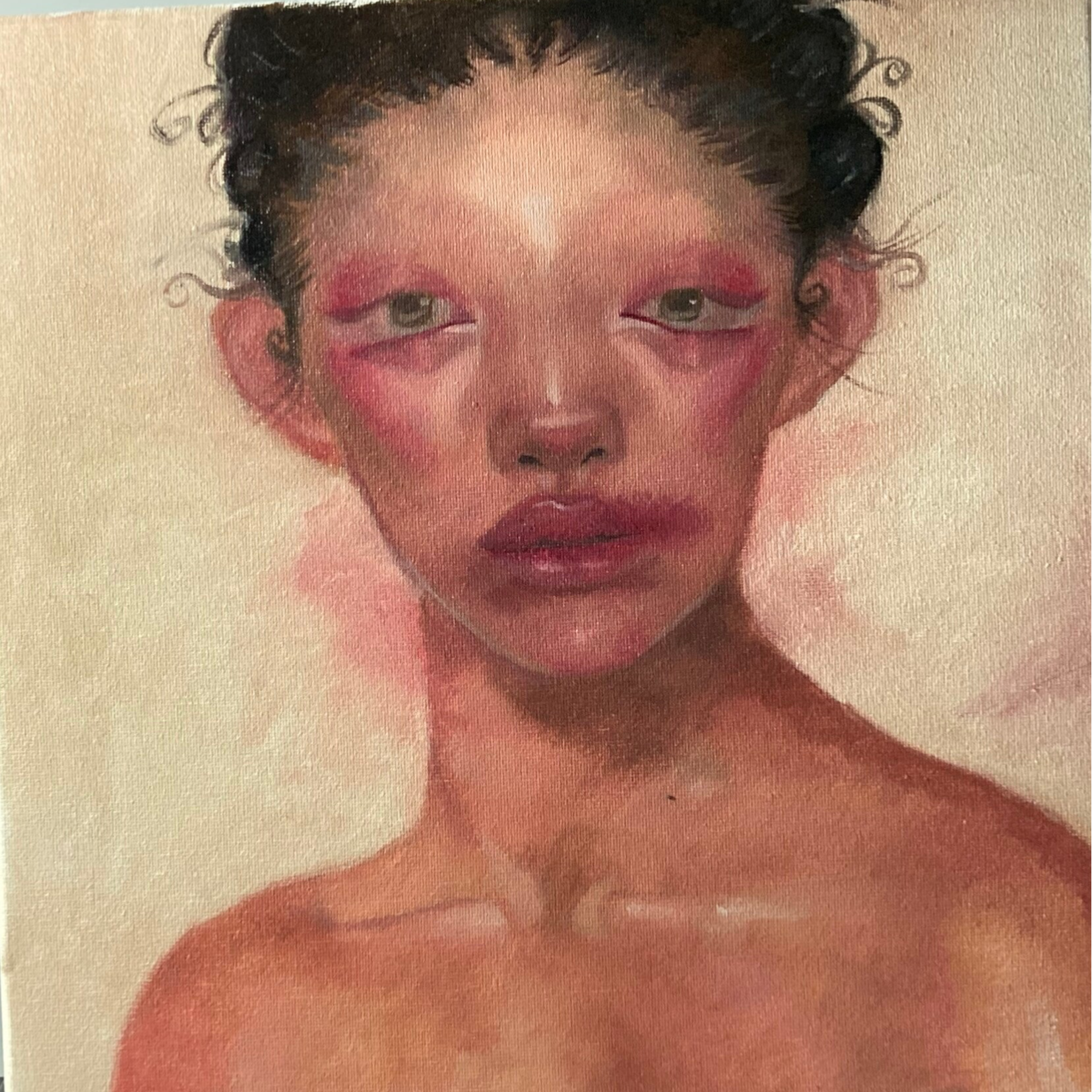 This piece depicts a woman facing someone with a look that gives off a sense of fear and hopelessness.